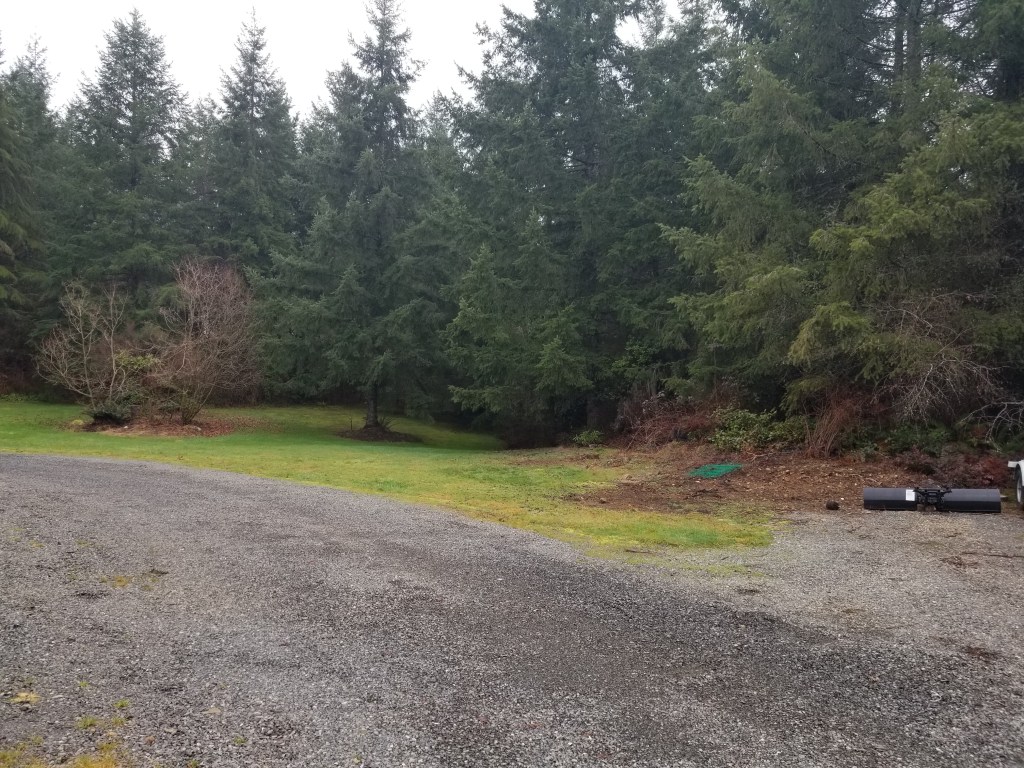 The start of this project will be the blank canvas of our side yard off the garage. You’ll see from the picture below that the area is currently just grass. We will first remove one more Douglas Fir tree to provide the needed space. This will be on the North side of the picture (right). Once that is gone, a piece of equipment will be used to level the selected area and we will then allow the winter rains to settle the ground work area.